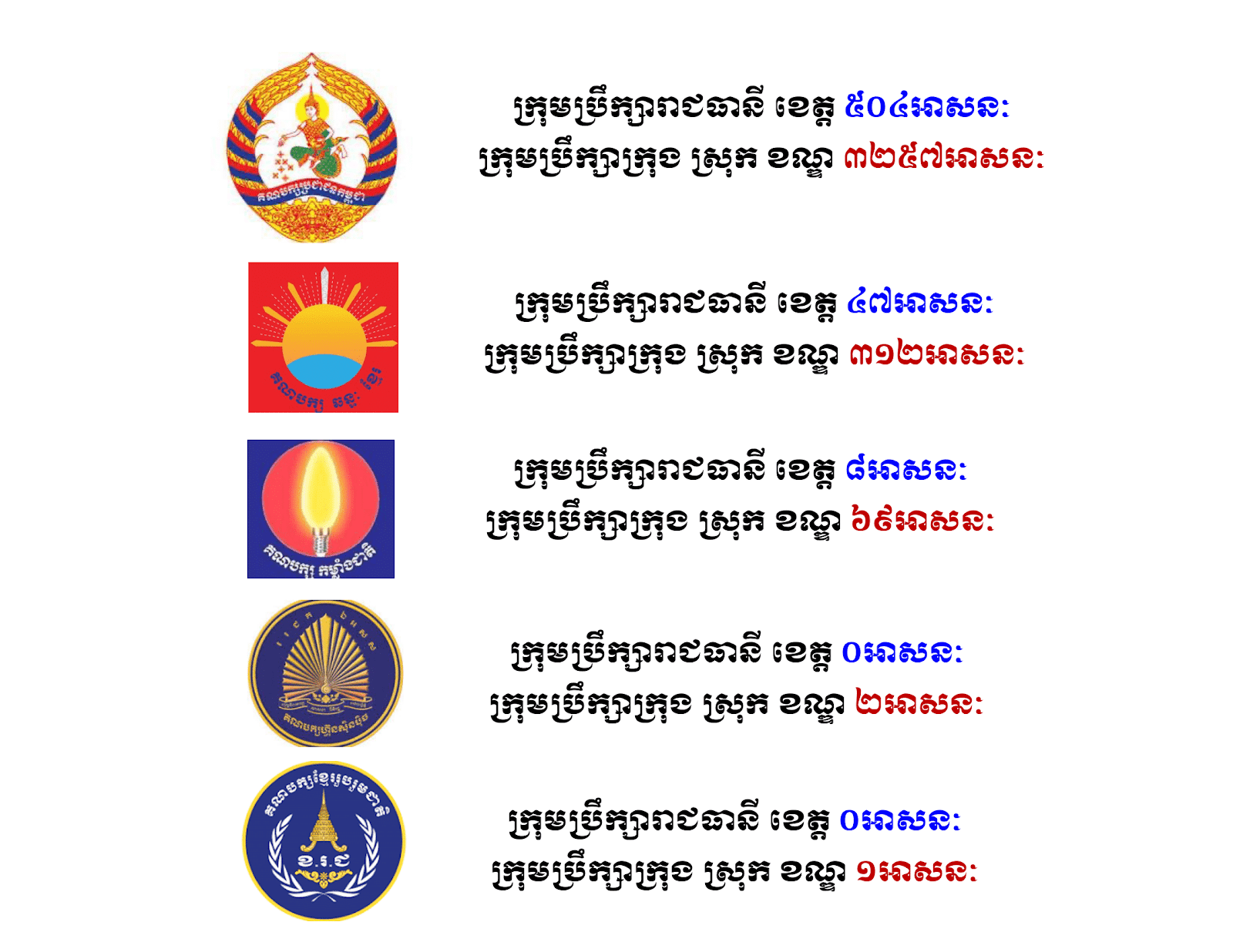 គួរបញ្ជាក់ថា តំណែងប្រធានក្រុមប្រឹក្សារាជធានី ខេត្ត ក្រុង ស្រុក ខណ្ឌ គឺបានទៅលើគណបក្សប្រជាជនកម្ពុជាទាំងអស់។ ក្នុងនោះប្រធានក្រុមប្រឹក្សារាជធានី ខេត្ត ២៥នាក់ និងប្រធានក្រុមប្រឹក្សាក្រុង ស្រុក ខណ្ឌ ចំនួន ២០៩នាក់។